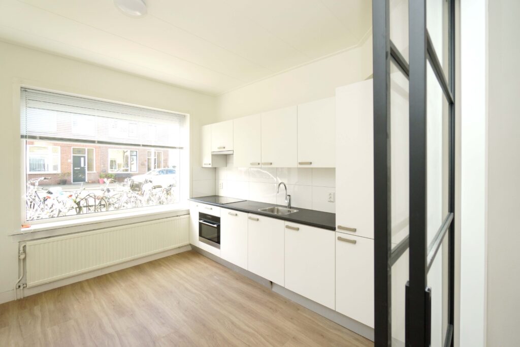 Recent gerenoveerde, gestoffeerde 4 -kamer beneden woning met stadstuintje. De woning beschikt over een ruime lichte woonkamer en een open moderne eetkeuken van maar liefst bijna 10 meter diep, die toegang geeft tot een leuke tuin.